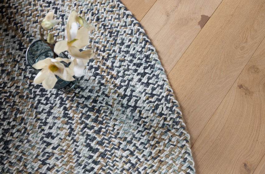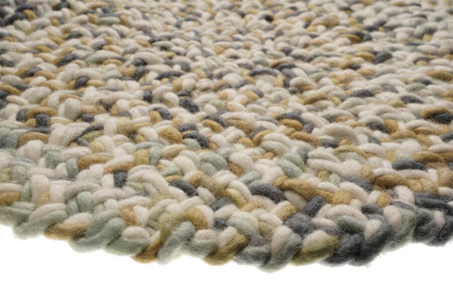 De Intorno is een rond vloerkleed gemaakt van een wol en polyester, deze materialen zijn handgeweven waardoor je vloerkleed niet alleen zacht maar ook sterk is. het vloerkleed bestaat uit 2 of meer kleuren, waaronder een basis kleur en daar meerdere kleuren doorheen gevlochten in het patroon.